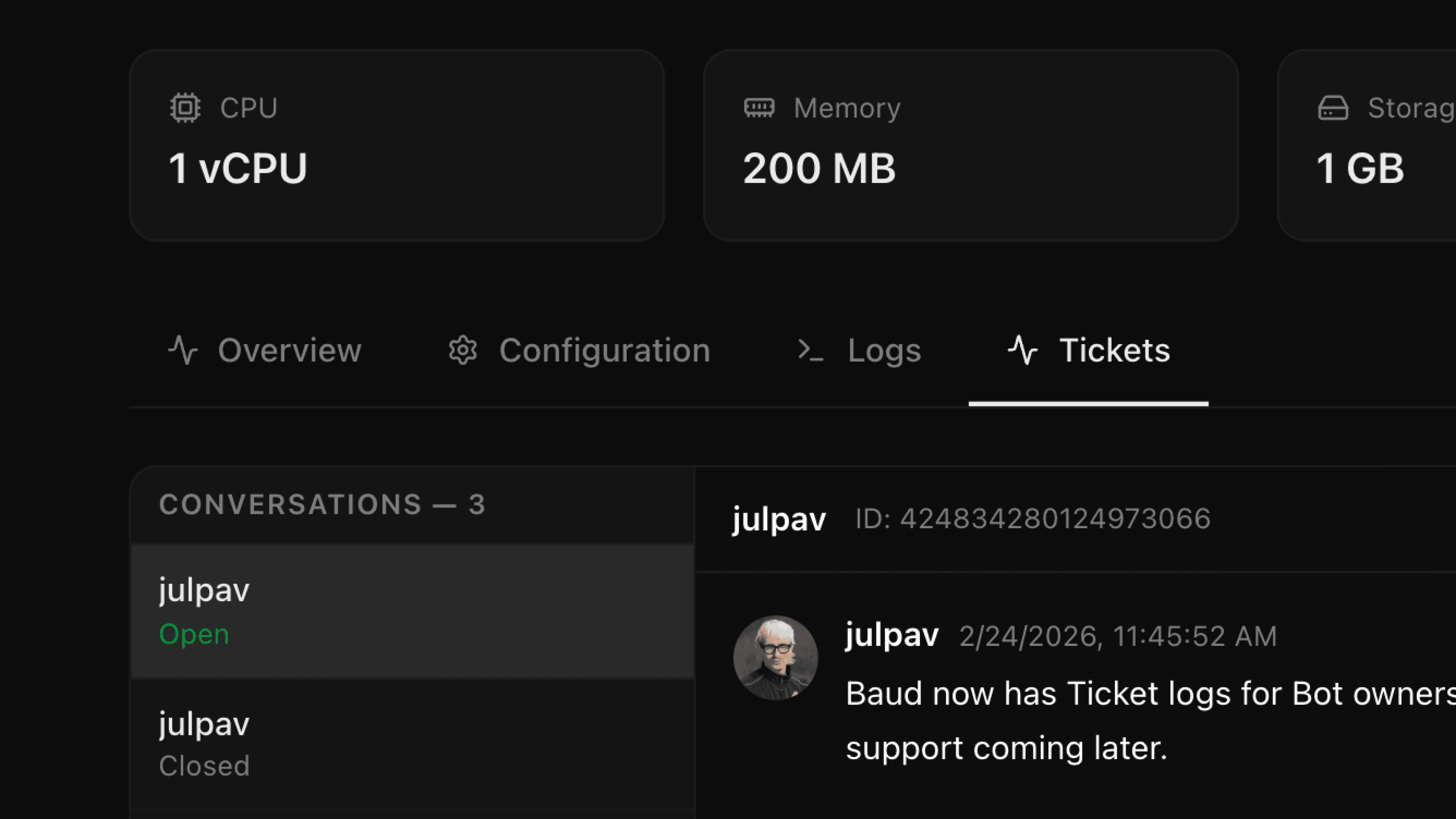 Right now, this ticket log viewer is only accessible to the bot/instance creator. Later, we'll add support for other users to view the ticket logs. To keep the system as simple as possible, we've placed the view under the same tabs on the instance.
